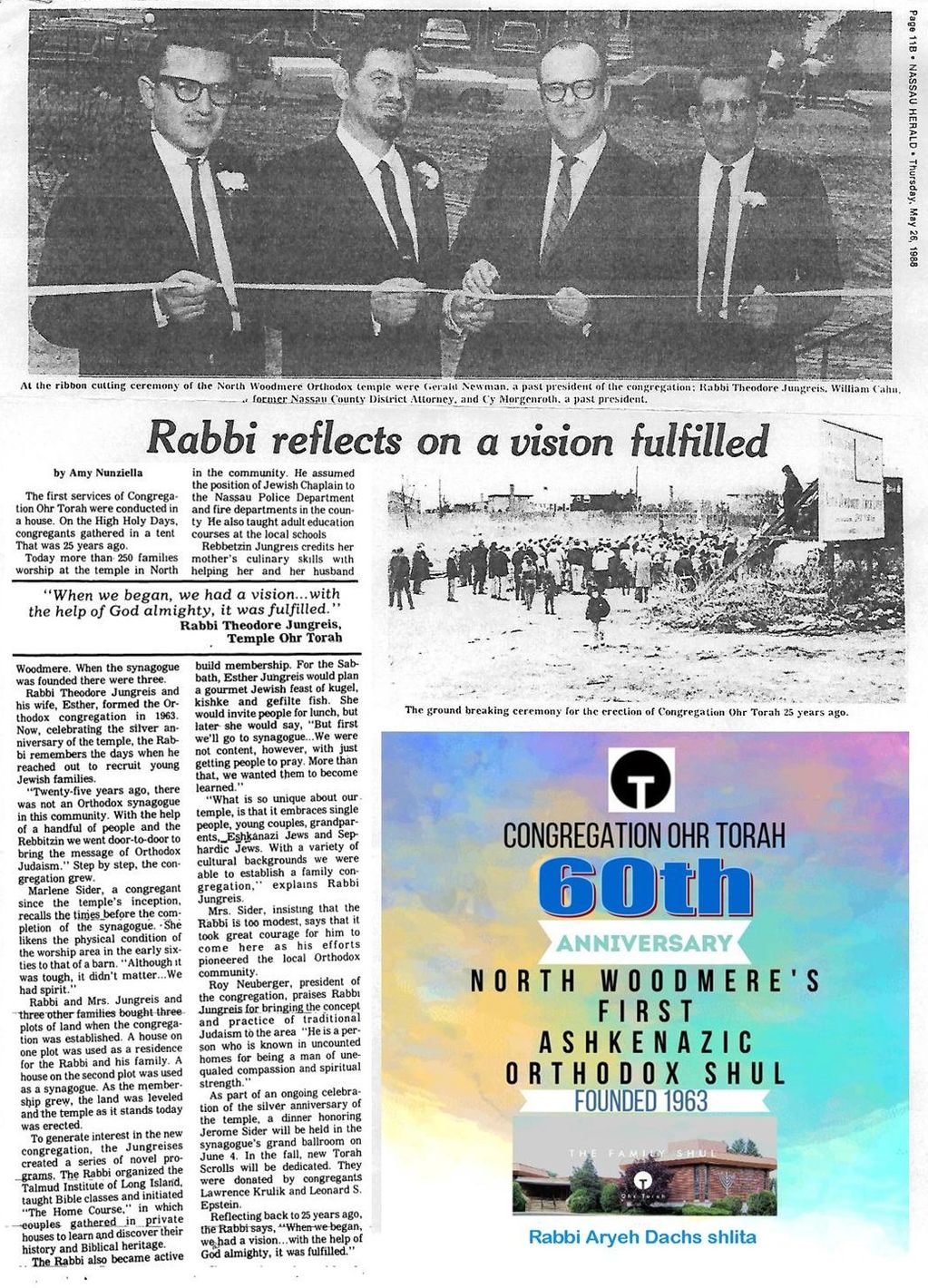Congregation Ohr Torah-The North Woodmere Jewish Center was founded over 60 years ago. North Woodmere's new residents yearned for an Orthodox Ashkenazic Synagogue. The arrivees, who consisted of both people "escaping" from a more urban environment as well as Holocaust survivors, pooled their resources and built our magnificent Synagogue, lead by Rabbi Meshulem Jungreis zt"l.